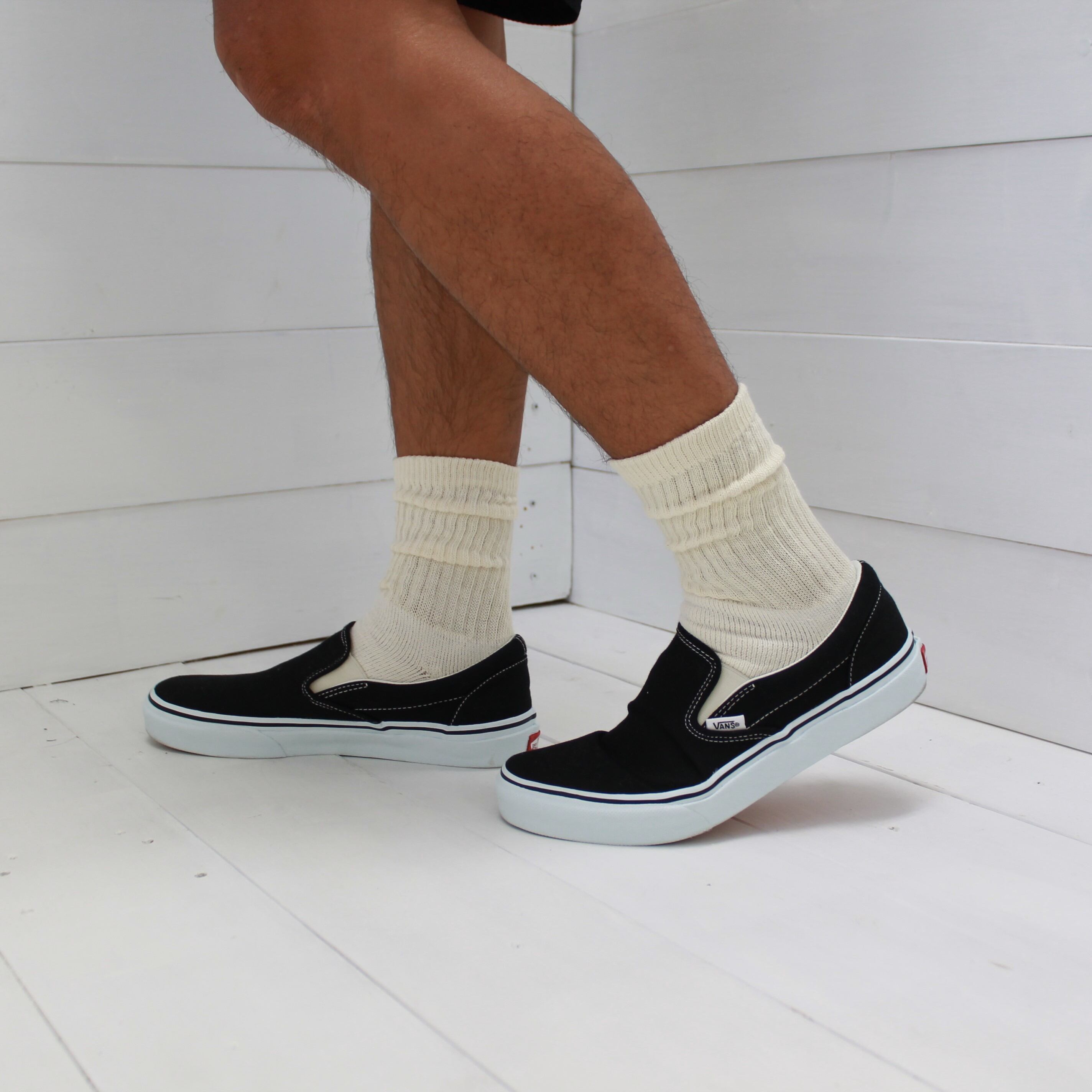 ゆるやかな締まりと快適な履き心地は、米国内でも根強い人気を誇るオーガニックコットンソックスで、ミドルカットブーツ、スニーカーと相性抜群の長さです。